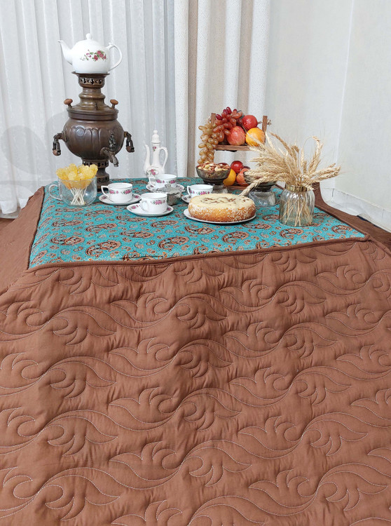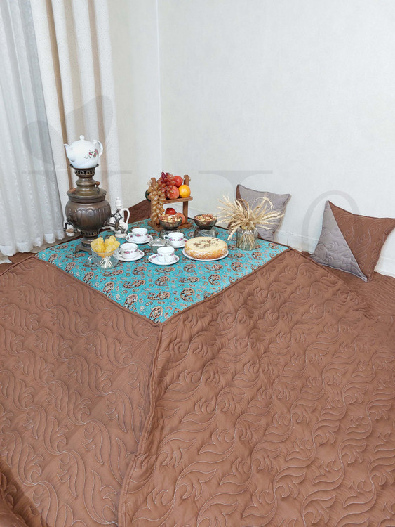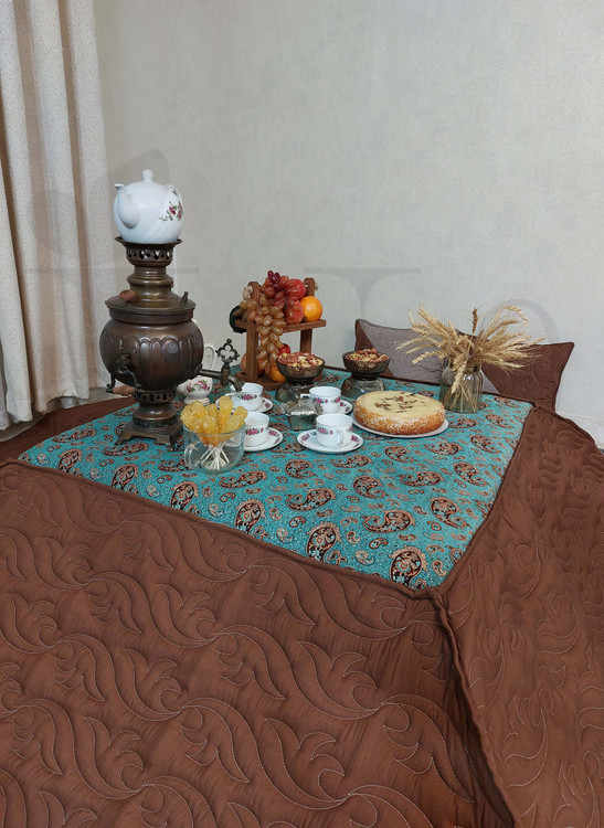 بخش مرکزی لحاف کرسی که از جنس پارچه ترمه می باشد به ابعاد 90*90 می باشد که روی میز قرار میگیرد و طرح دوخت ساده تری دارد که وسایل روی میز ثابت بمانند.